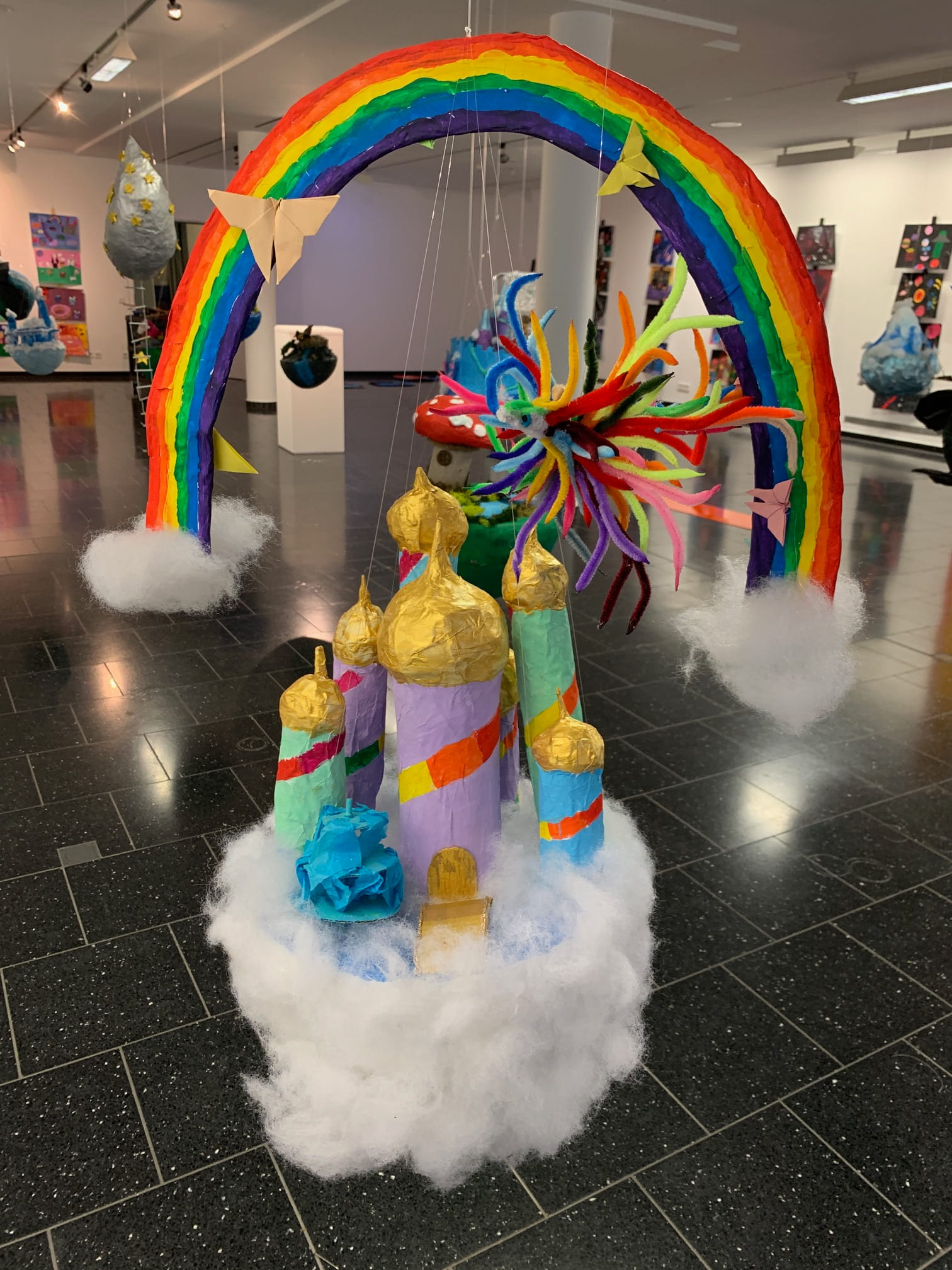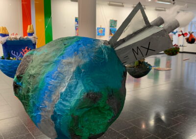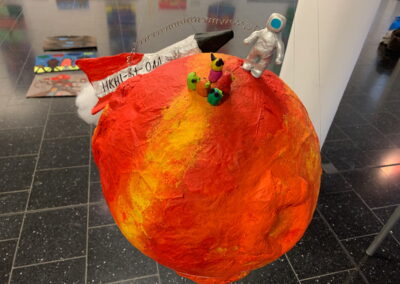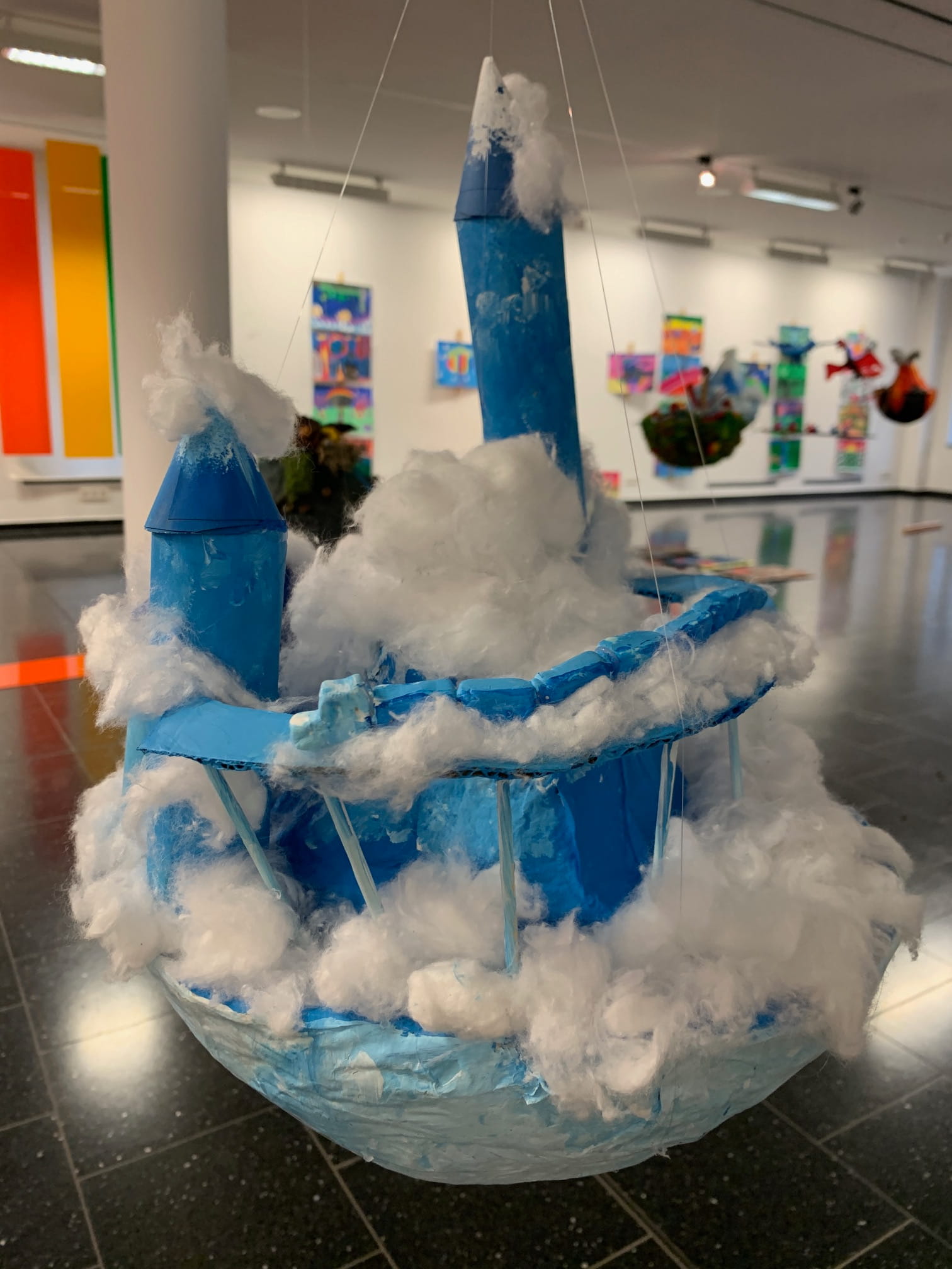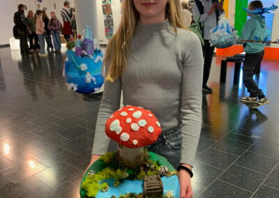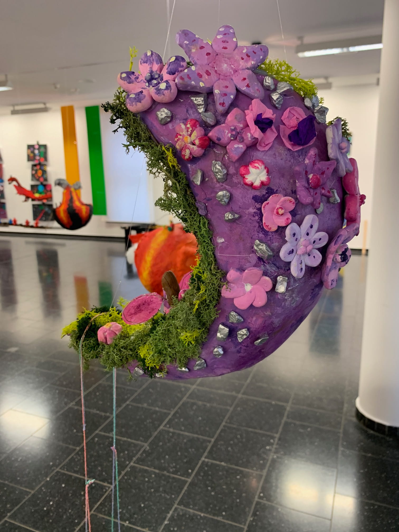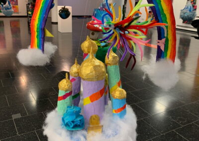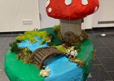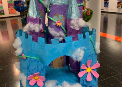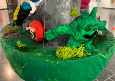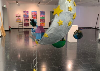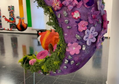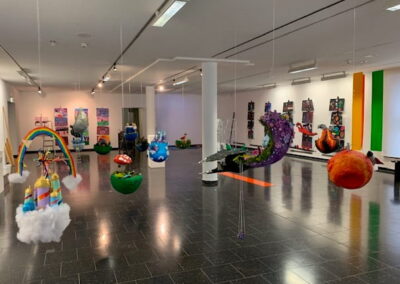 Mit viel Fantasie und einer breiten Farbpalette haben die Schülerinnen und Schüler einerseits „Traumwelten“ malerisch umgesetzt und andererseits „Schwebende Fantasiewelten“ plastiziert, die als (Halb-) Kugeln von der Decke hängen: Die Regenbogenwelt hängt neben der Unterwasserwelt und auf der nächsten Halbkugel thront ein luftiges Wolkenschloss. Die Eis- und die Lavawelt sind durch eine Brücke miteinander verbunden und es entsteht ein Kampf der Elemente. So unterschiedlich wie die Persönlichkeiten und Interessen der jungen Kunstschaffenden sind, fällt auch die thematische Wahl ihrer Traum- und Fantasiewelten aus.