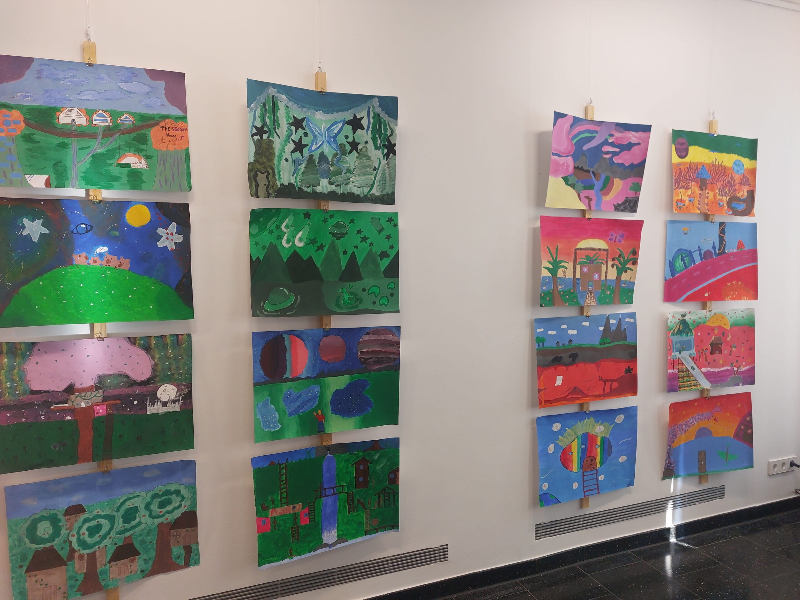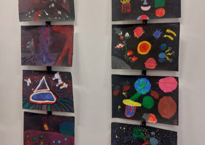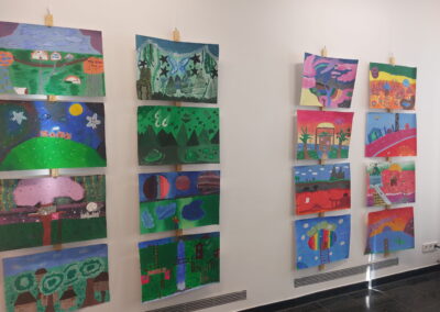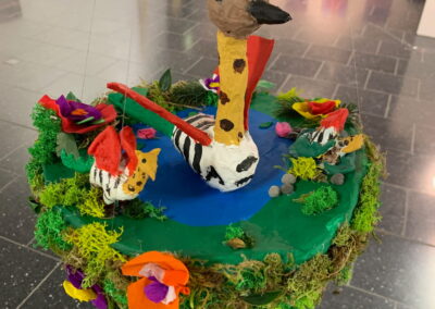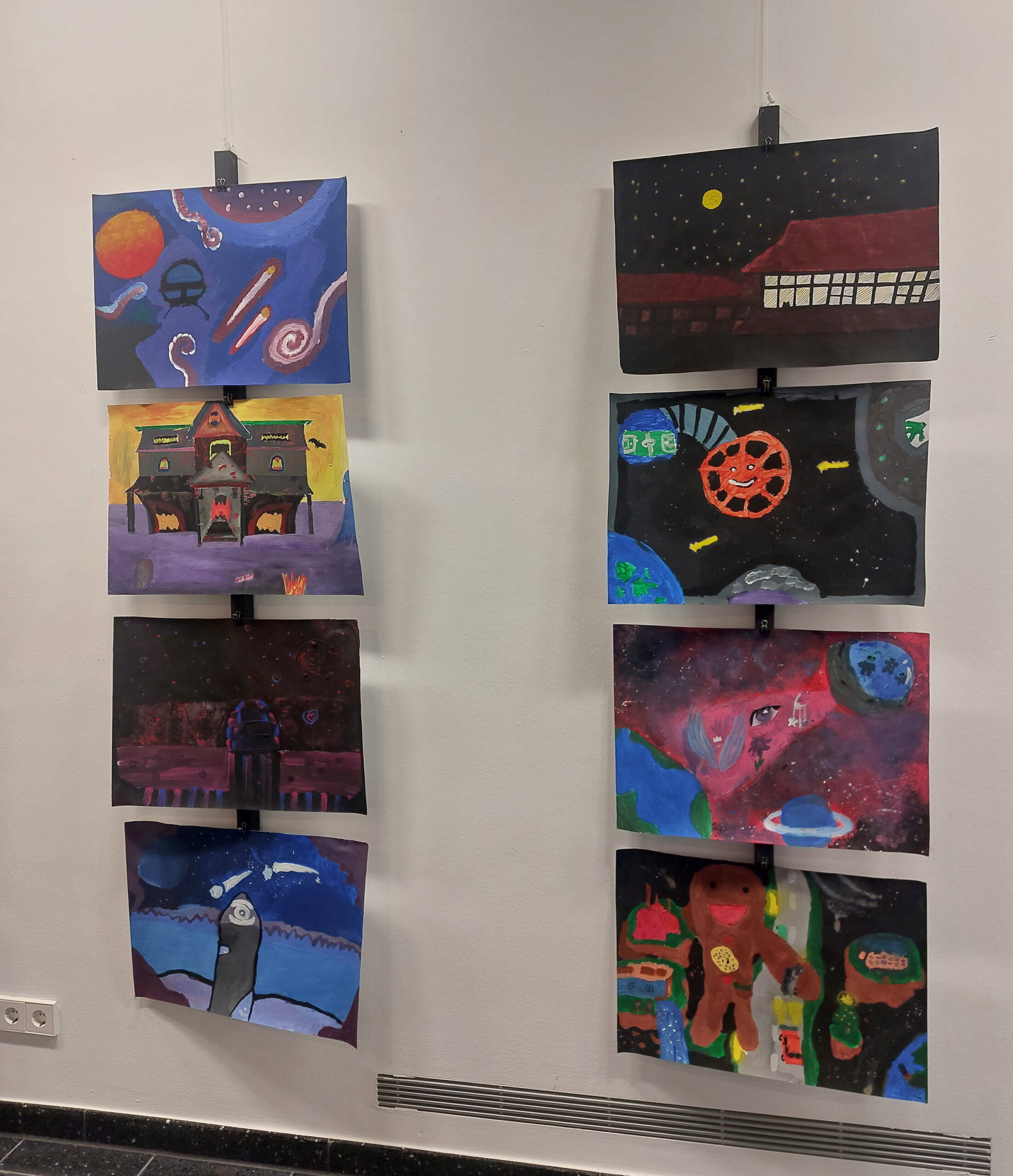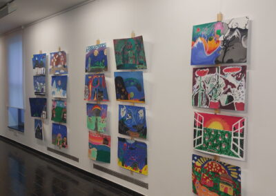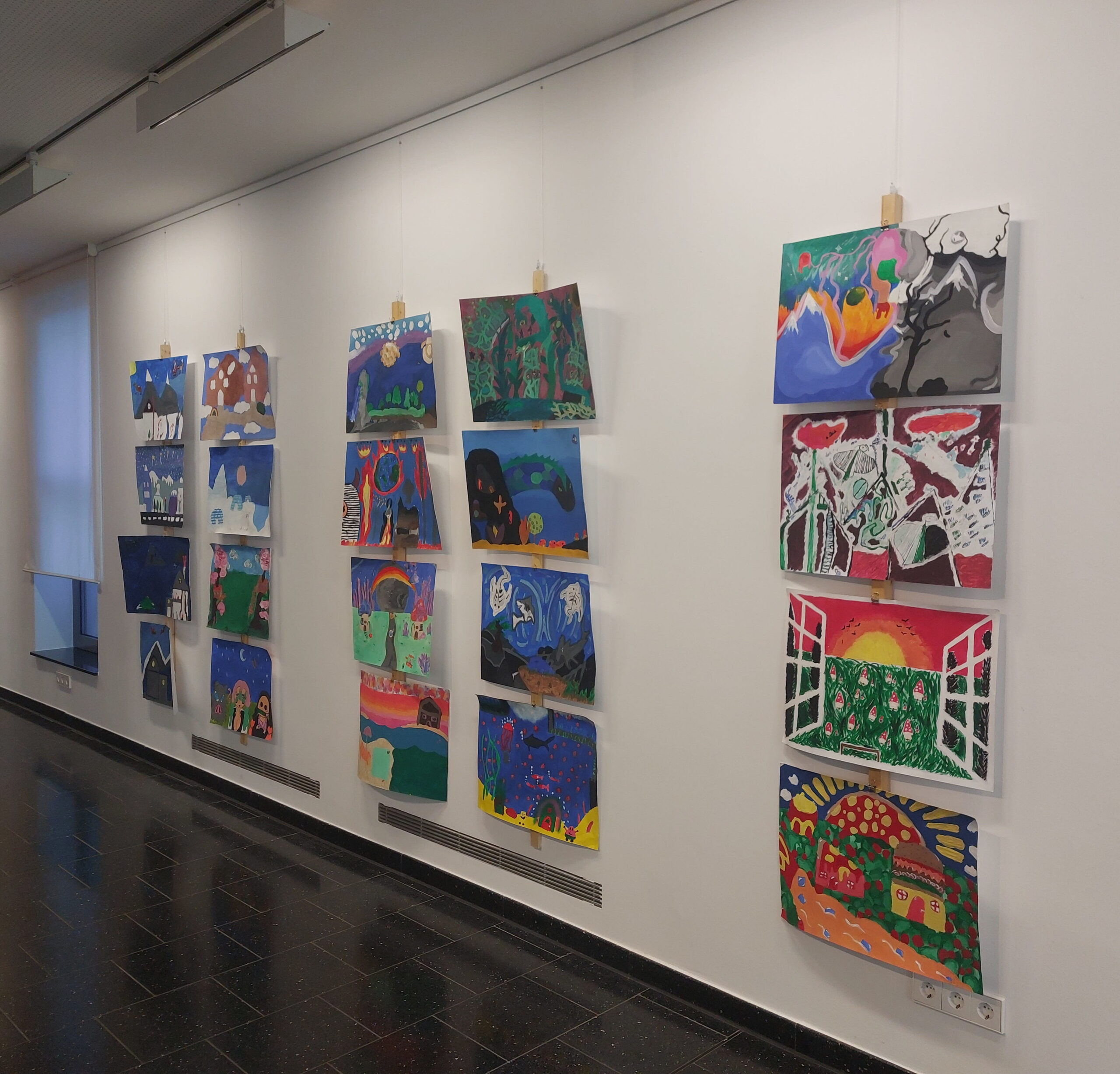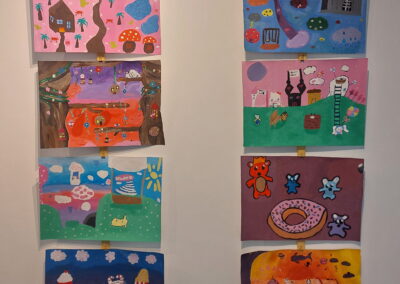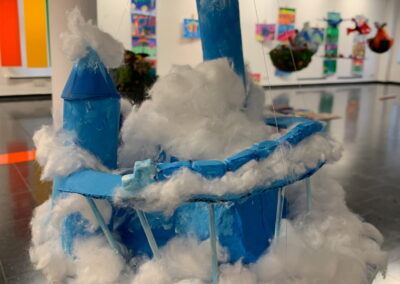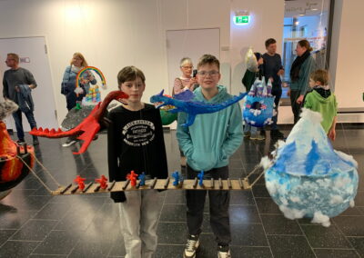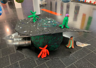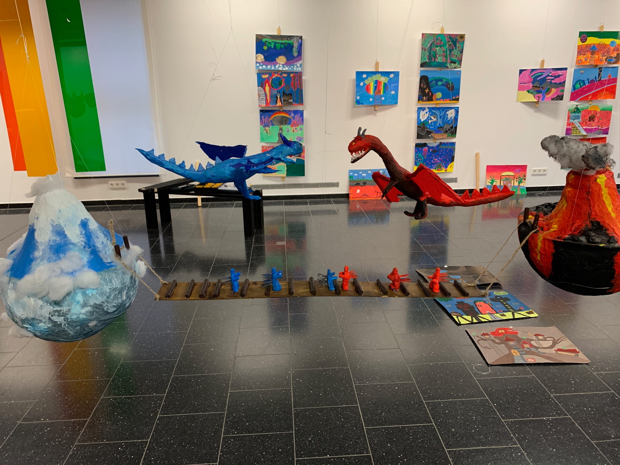 Mit viel Fantasie und einer breiten Farbpalette haben die Schülerinnen und Schüler einerseits „Traumwelten“ malerisch umgesetzt und andererseits „Schwebende Fantasiewelten“ plastiziert, die als (Halb-) Kugeln von der Decke hängen: Die Regenbogenwelt hängt neben der Unterwasserwelt und auf der nächsten Halbkugel thront ein luftiges Wolkenschloss. Die Eis- und die Lavawelt sind durch eine Brücke miteinander verbunden und es entsteht ein Kampf der Elemente. So unterschiedlich wie die Persönlichkeiten und Interessen der jungen Kunstschaffenden sind, fällt auch die thematische Wahl ihrer Traum- und Fantasiewelten aus.