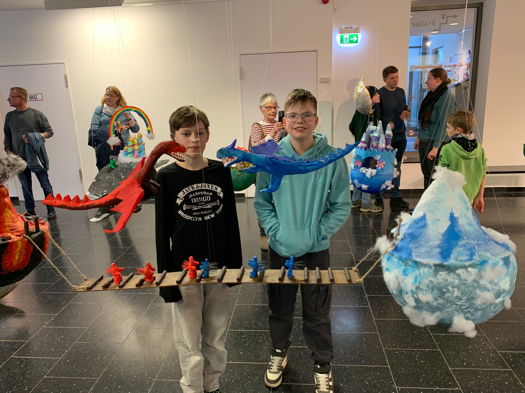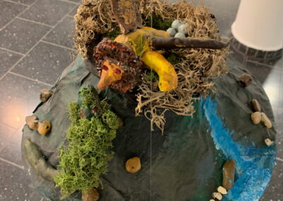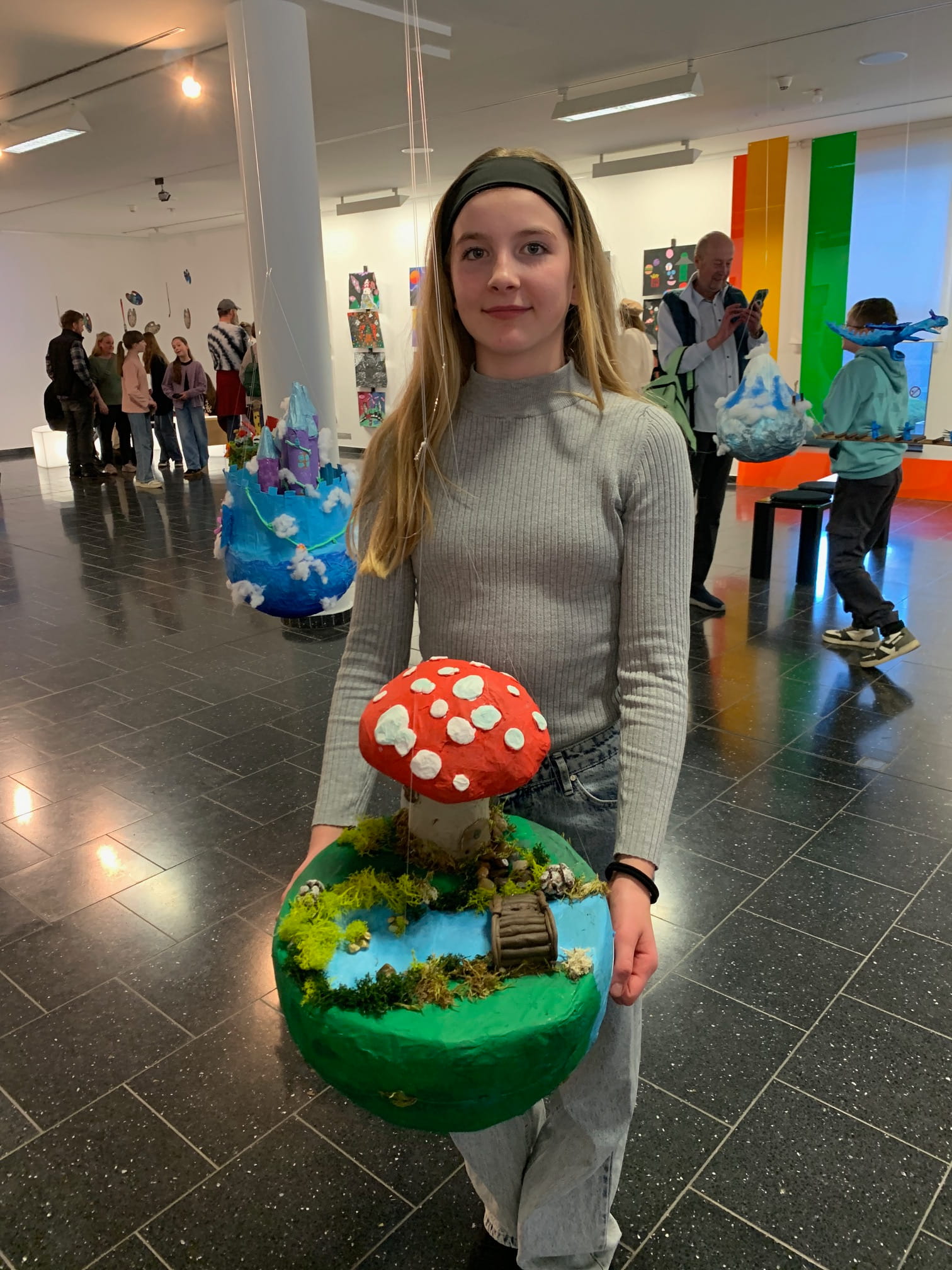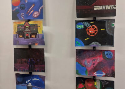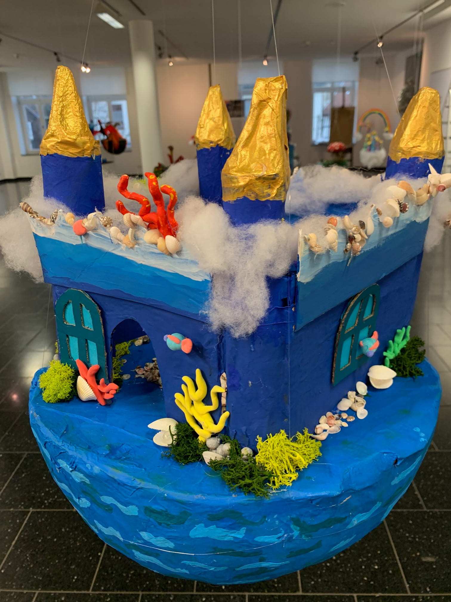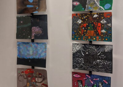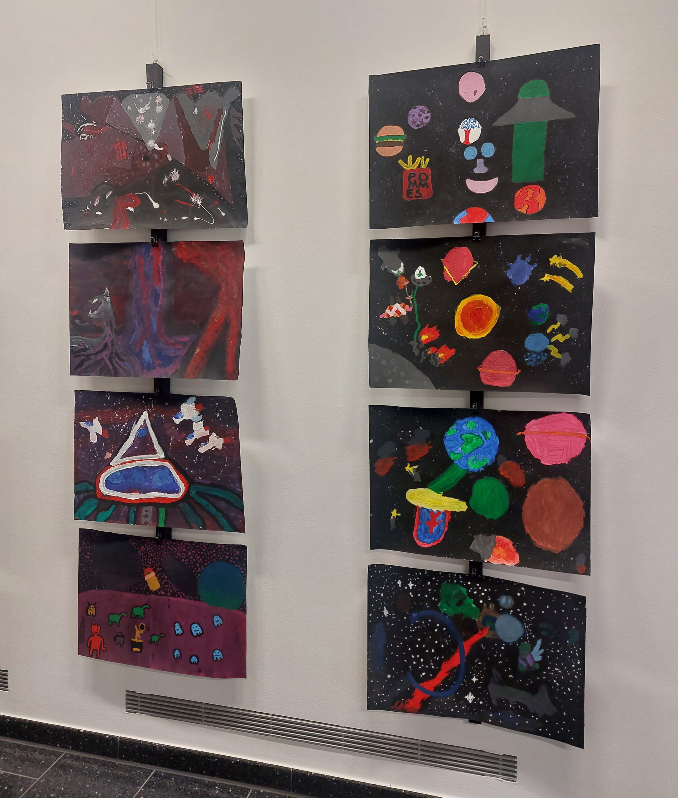 Mit viel Fantasie und einer breiten Farbpalette haben die Schülerinnen und Schüler einerseits „Traumwelten“ malerisch umgesetzt und andererseits „Schwebende Fantasiewelten“ plastiziert, die als (Halb-) Kugeln von der Decke hängen: Die Regenbogenwelt hängt neben der Unterwasserwelt und auf der nächsten Halbkugel thront ein luftiges Wolkenschloss. Die Eis- und die Lavawelt sind durch eine Brücke miteinander verbunden und es entsteht ein Kampf der Elemente. So unterschiedlich wie die Persönlichkeiten und Interessen der jungen Kunstschaffenden sind, fällt auch die thematische Wahl ihrer Traum- und Fantasiewelten aus.