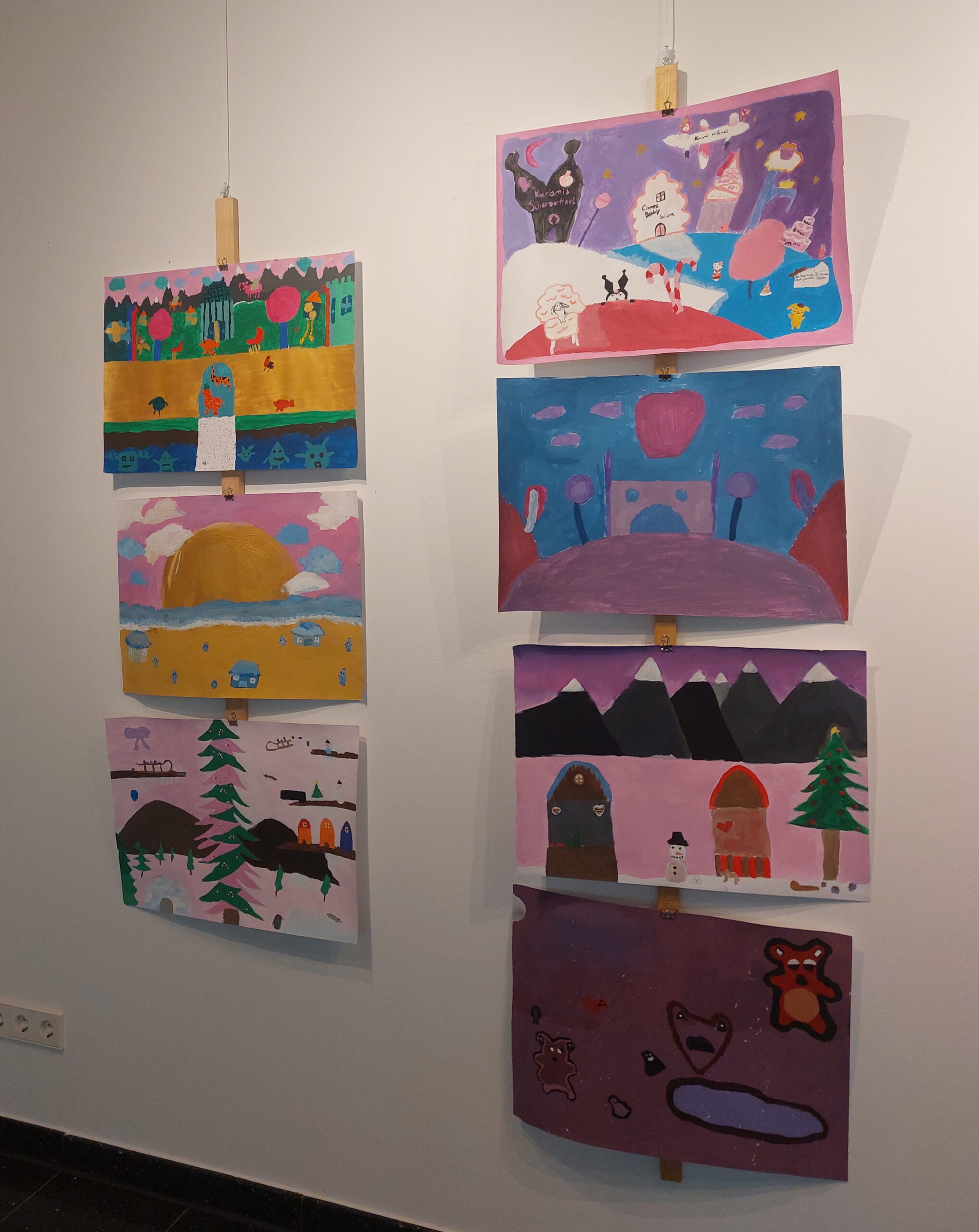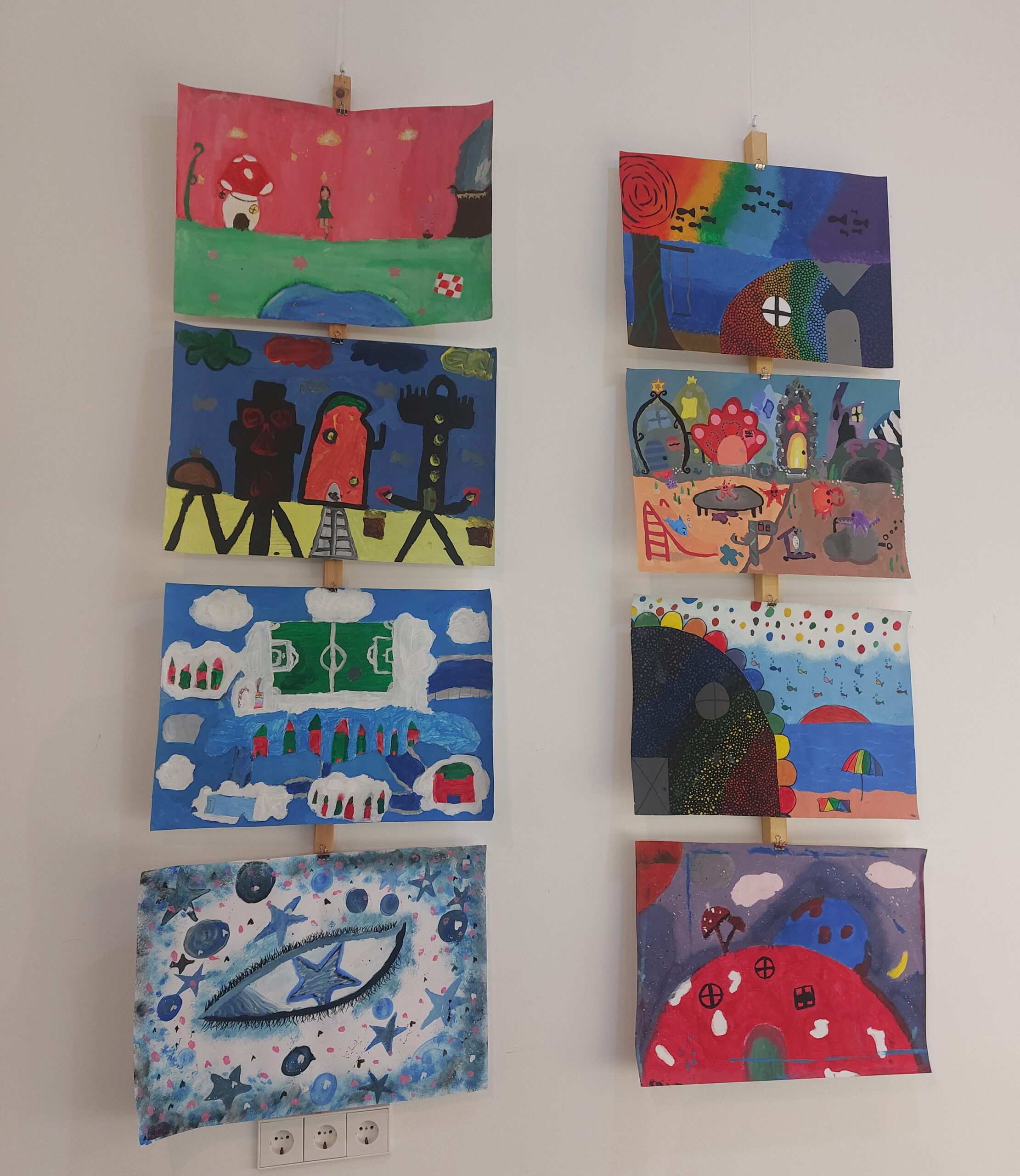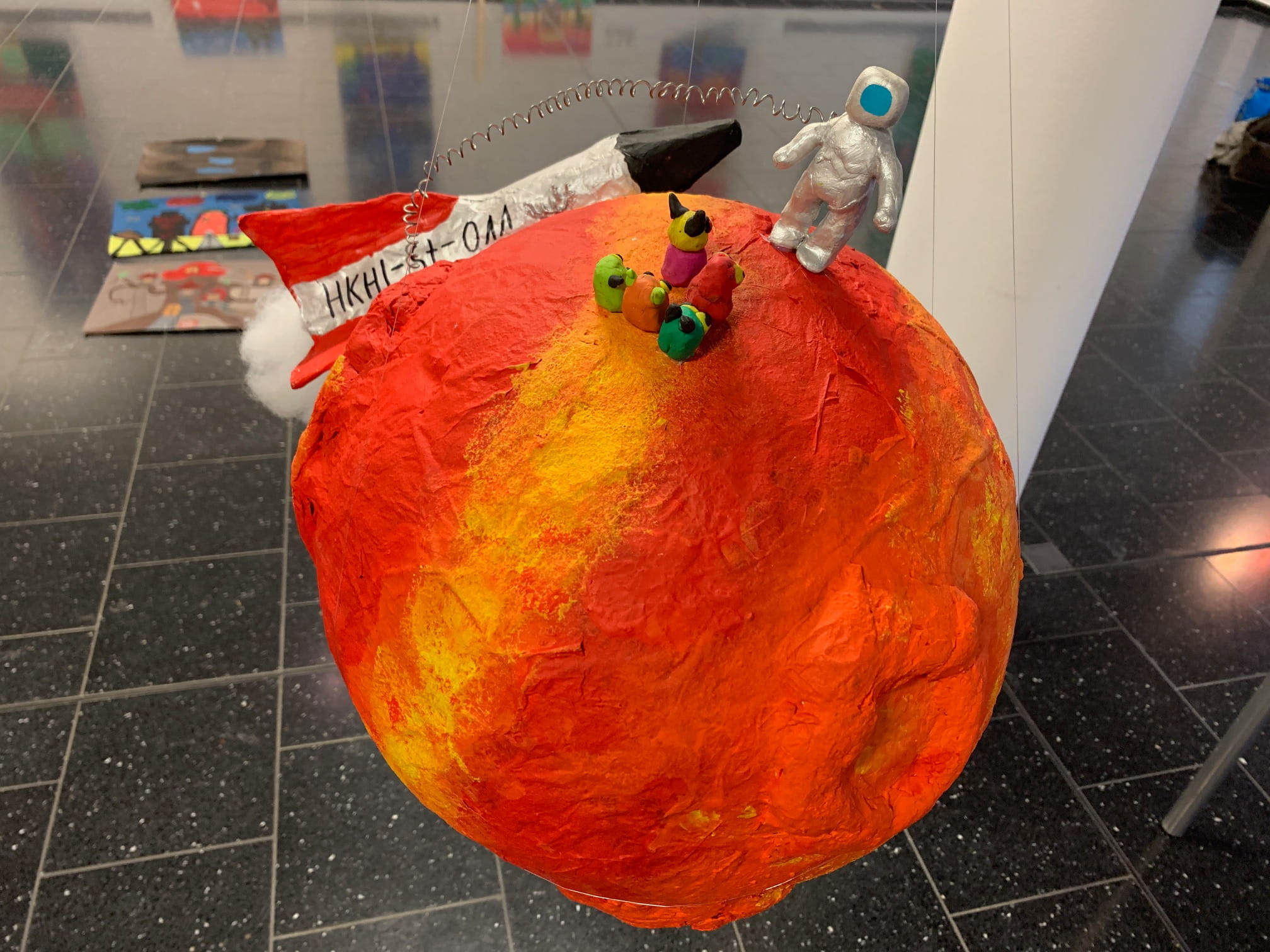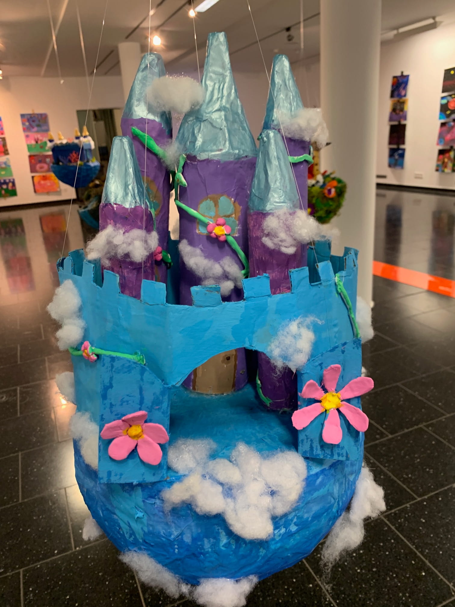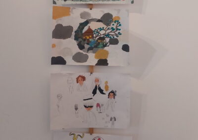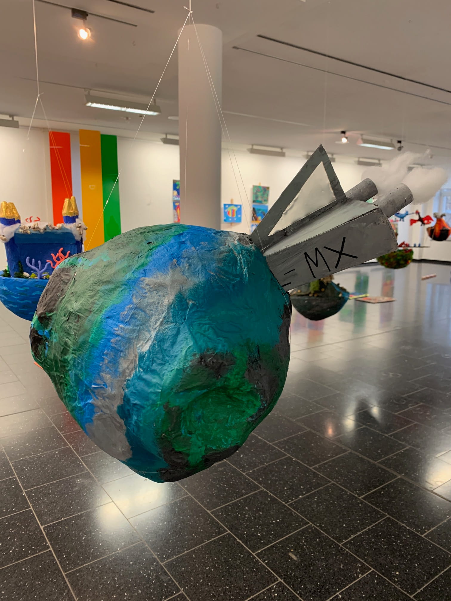 Mit viel Fantasie und einer breiten Farbpalette haben die Schülerinnen und Schüler einerseits „Traumwelten“ malerisch umgesetzt und andererseits „Schwebende Fantasiewelten“ plastiziert, die als (Halb-) Kugeln von der Decke hängen: Die Regenbogenwelt hängt neben der Unterwasserwelt und auf der nächsten Halbkugel thront ein luftiges Wolkenschloss. Die Eis- und die Lavawelt sind durch eine Brücke miteinander verbunden und es entsteht ein Kampf der Elemente. So unterschiedlich wie die Persönlichkeiten und Interessen der jungen Kunstschaffenden sind, fällt auch die thematische Wahl ihrer Traum- und Fantasiewelten aus.