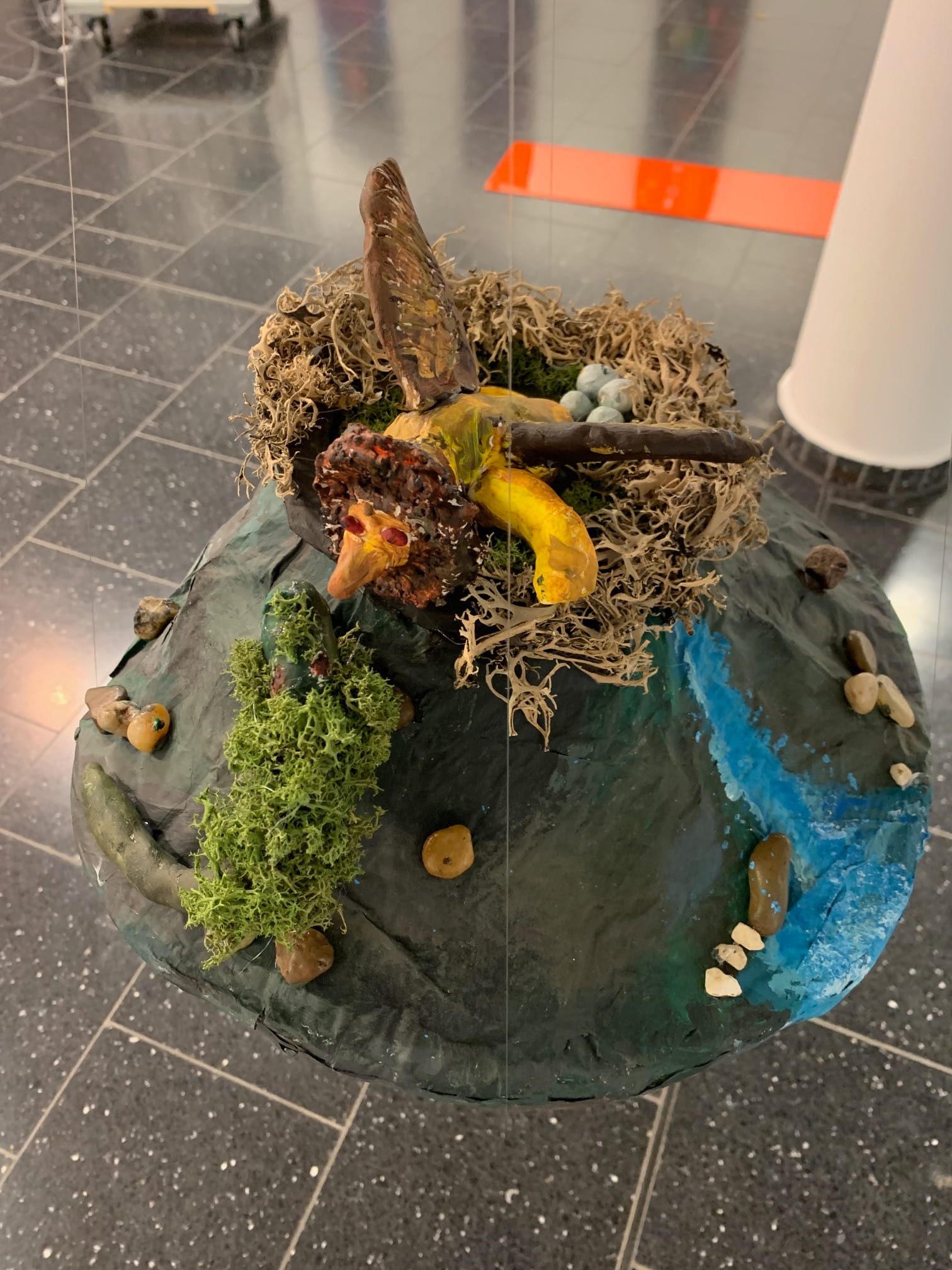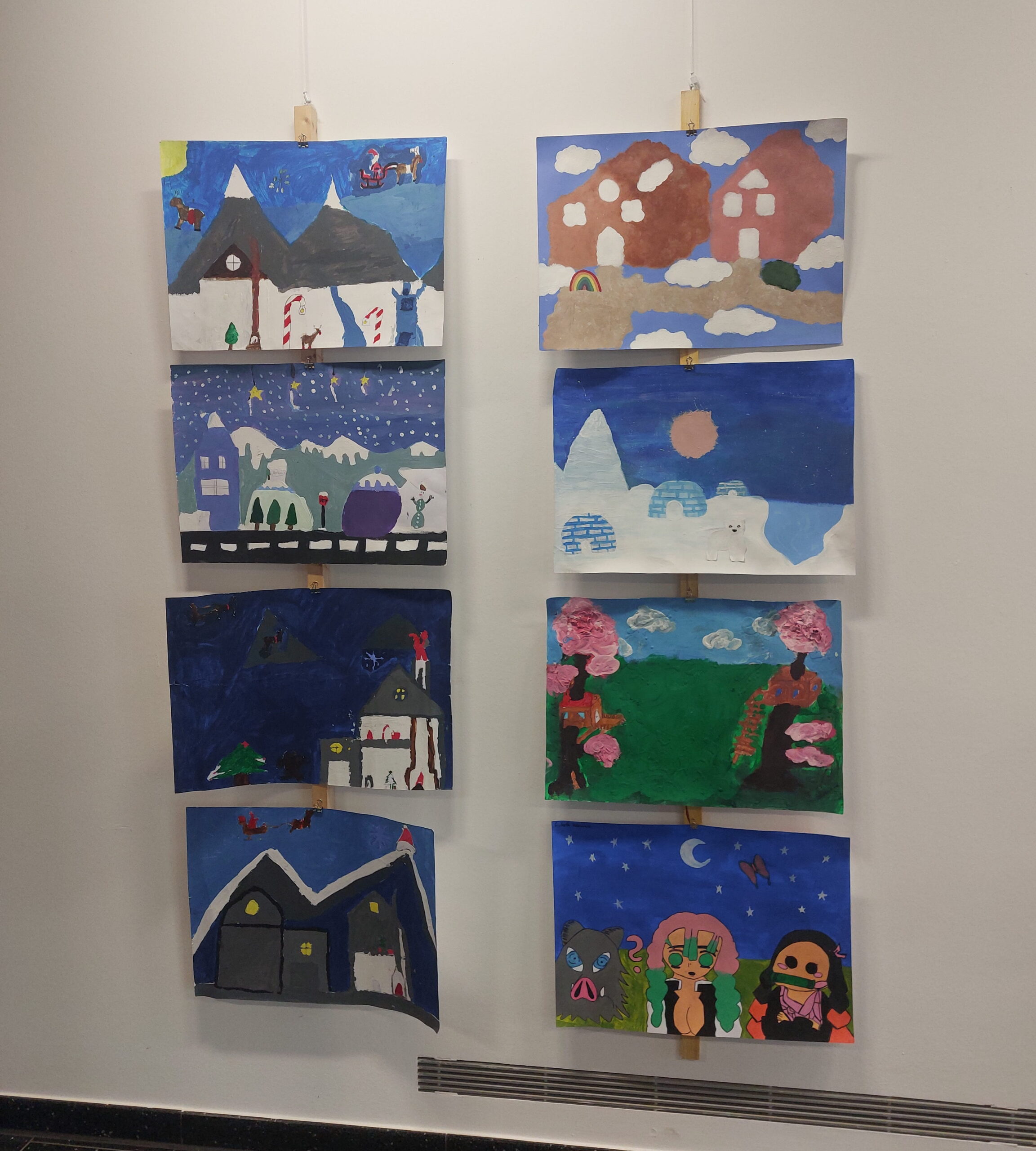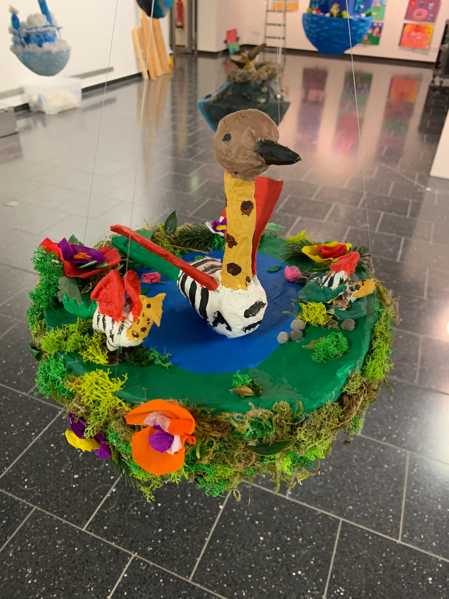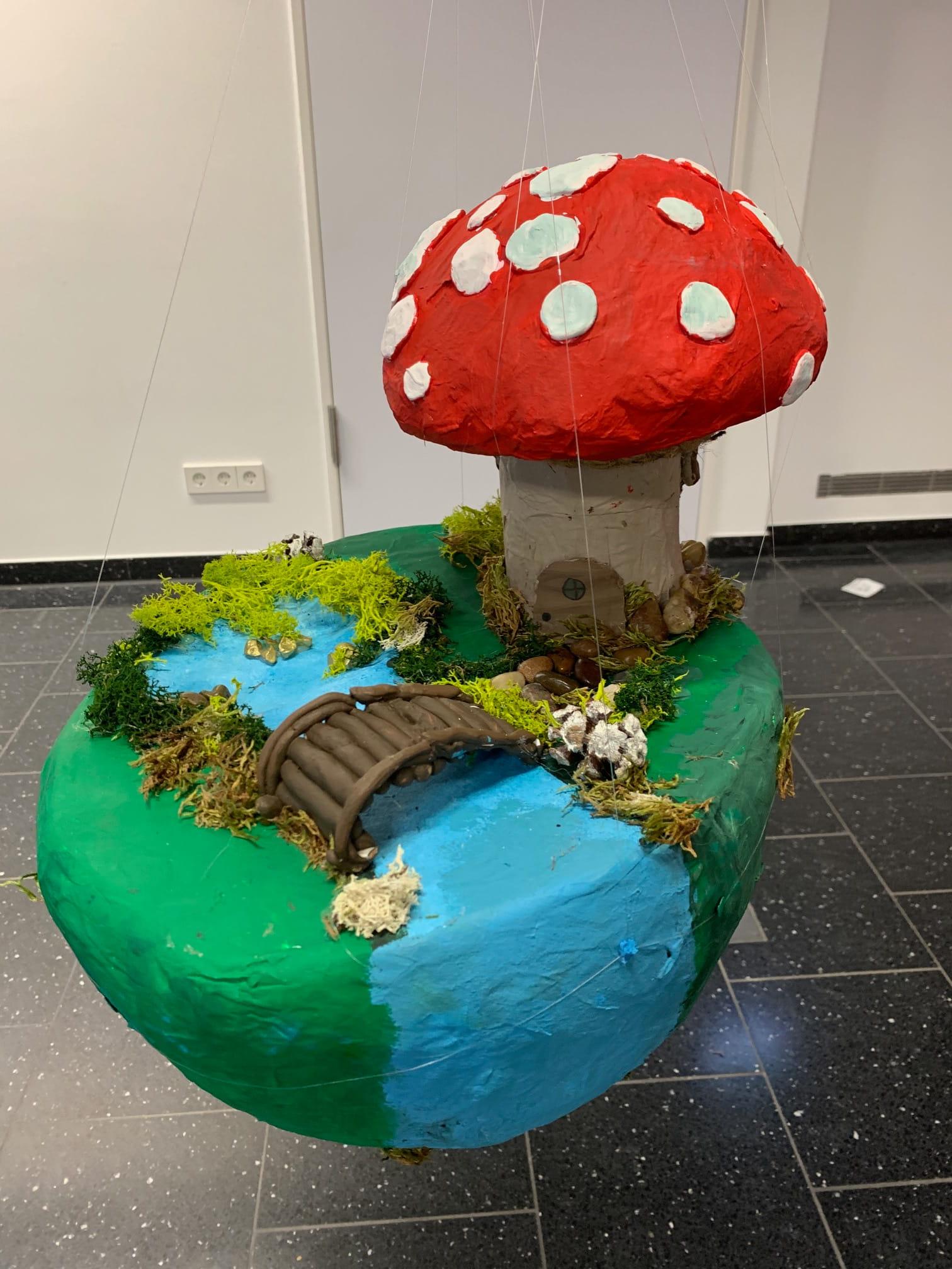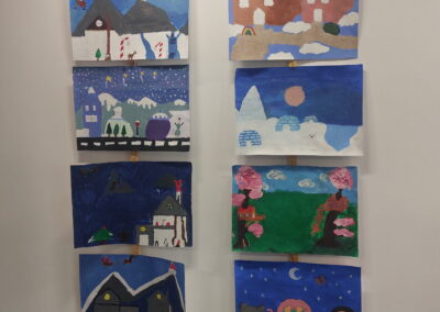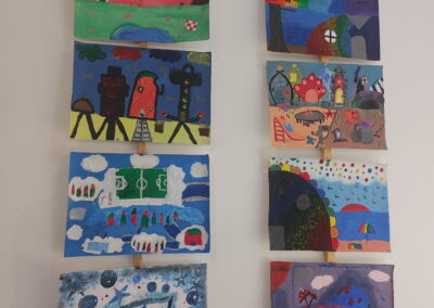 Mit viel Fantasie und einer breiten Farbpalette haben die Schülerinnen und Schüler einerseits „Traumwelten“ malerisch umgesetzt und andererseits „Schwebende Fantasiewelten“ plastiziert, die als (Halb-) Kugeln von der Decke hängen: Die Regenbogenwelt hängt neben der Unterwasserwelt und auf der nächsten Halbkugel thront ein luftiges Wolkenschloss. Die Eis- und die Lavawelt sind durch eine Brücke miteinander verbunden und es entsteht ein Kampf der Elemente. So unterschiedlich wie die Persönlichkeiten und Interessen der jungen Kunstschaffenden sind, fällt auch die thematische Wahl ihrer Traum- und Fantasiewelten aus.