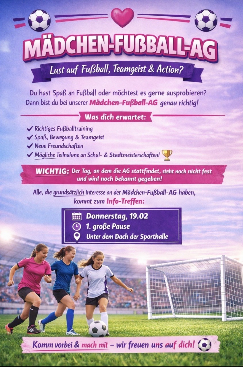 In der Woche vom 09.02. bis 13.02.26 findet keine AG statt. Nach Karneval ab dem 19.02.2026 läuft der AG-Betrieb wieder regelmäßig.
